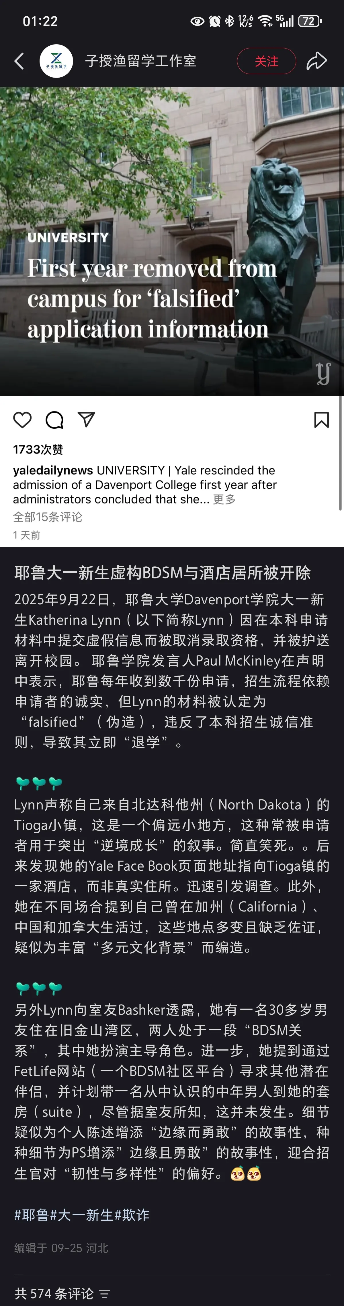 有个人因为在入学材料里编造自己的bdsm经历,被耶鲁大学查出来退学了……