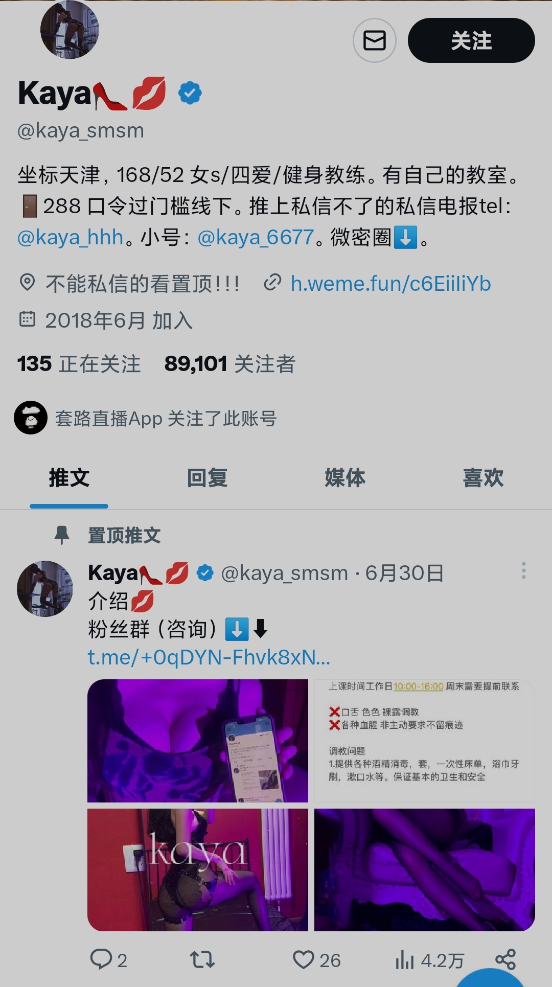 我其实想去试试,我在这边,她也给了我项目价格表,可是我看推特下面几乎没评论,所以不太敢去怕有风险,我不懂怕被骗,毕竟要是脱光了手机也不在身边要是冲进来几个人感觉一点办法都没有。我看推特上的视频应该是在一个高层里面,我没问具体地址,不确定的因素挺多不敢去。基础的价格是1000,如果能确定安全我挺想去试试。