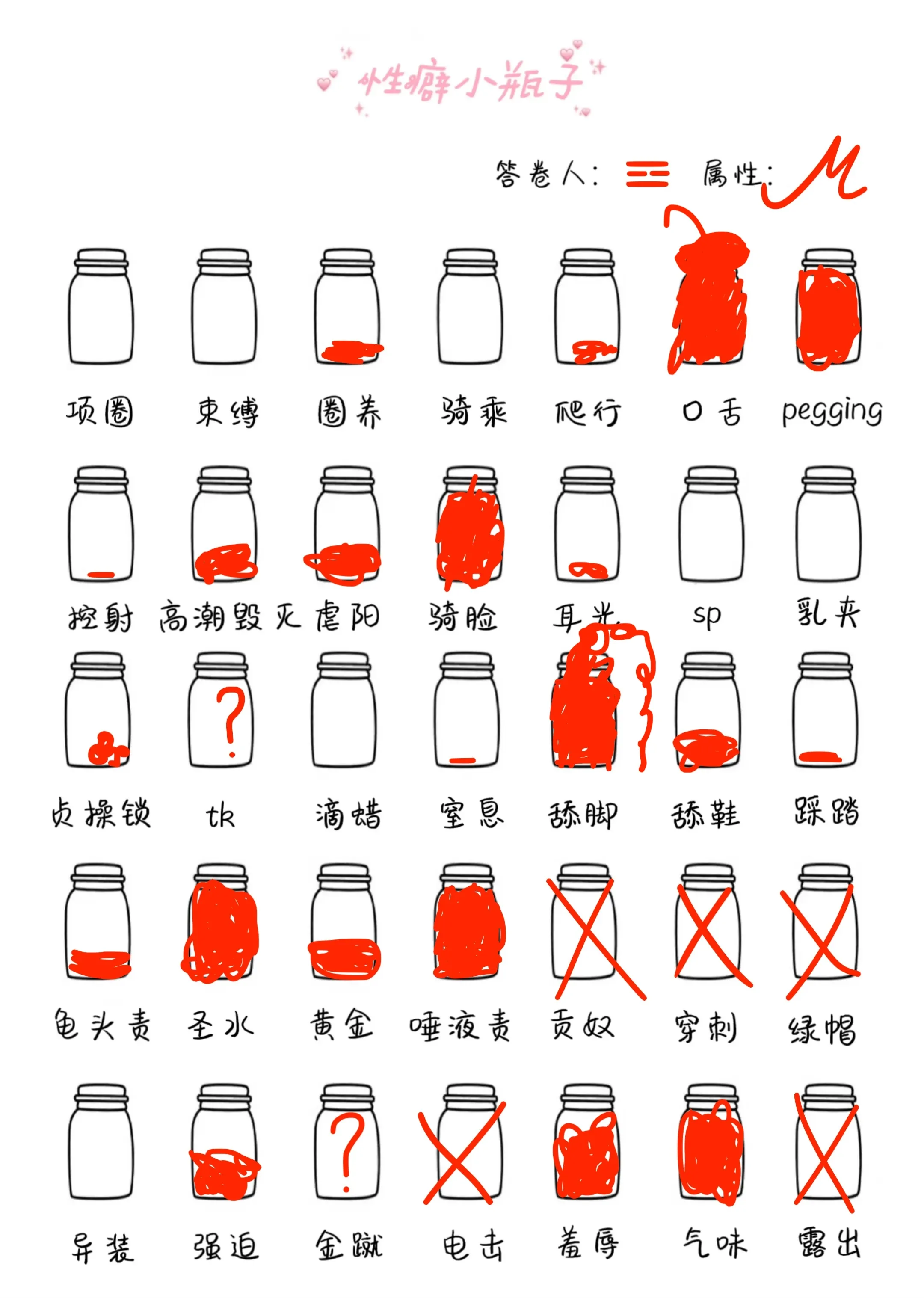 和yue老师的xp意外的契合呢,白色是没兴趣但可以接受,红叉是无法接受,金就和高潮毁灭不清楚是什么意思