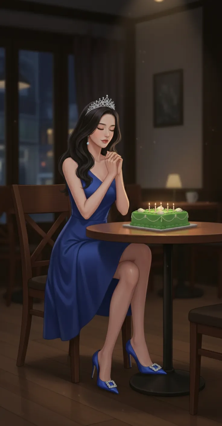 全部换上之后,我在镜子前站了几秒。蓝色在身上反而显得很干净,裙摆垂得恰到好处,鞋跟挺直,上面的钻饰被灯光一打,比我预想的还要好看。