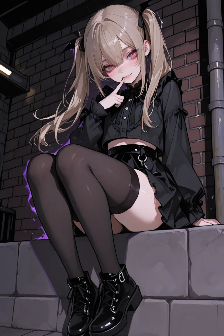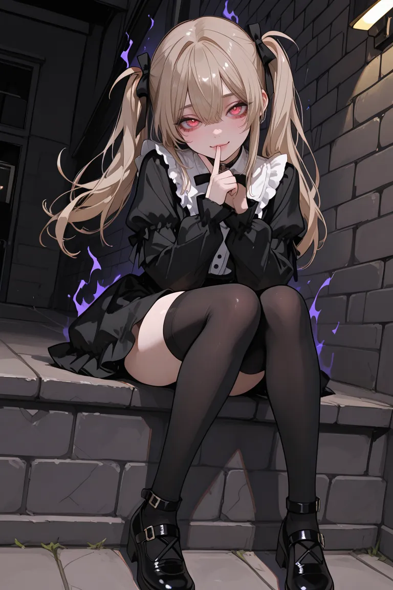 龚自祯循声望去,只见庭院的矮墙上,坐着一个娇小的身影。她穿着一身繁复精致的黑色哥特裙,层层叠叠的蕾丝花边随着她晃动的双腿轻轻摇曳。浅棕色的双马尾俏皮地垂在肩头,夕阳的光芒柔和地洒在她身上,让她看起来像一个从童话里走出来的精致人偶。