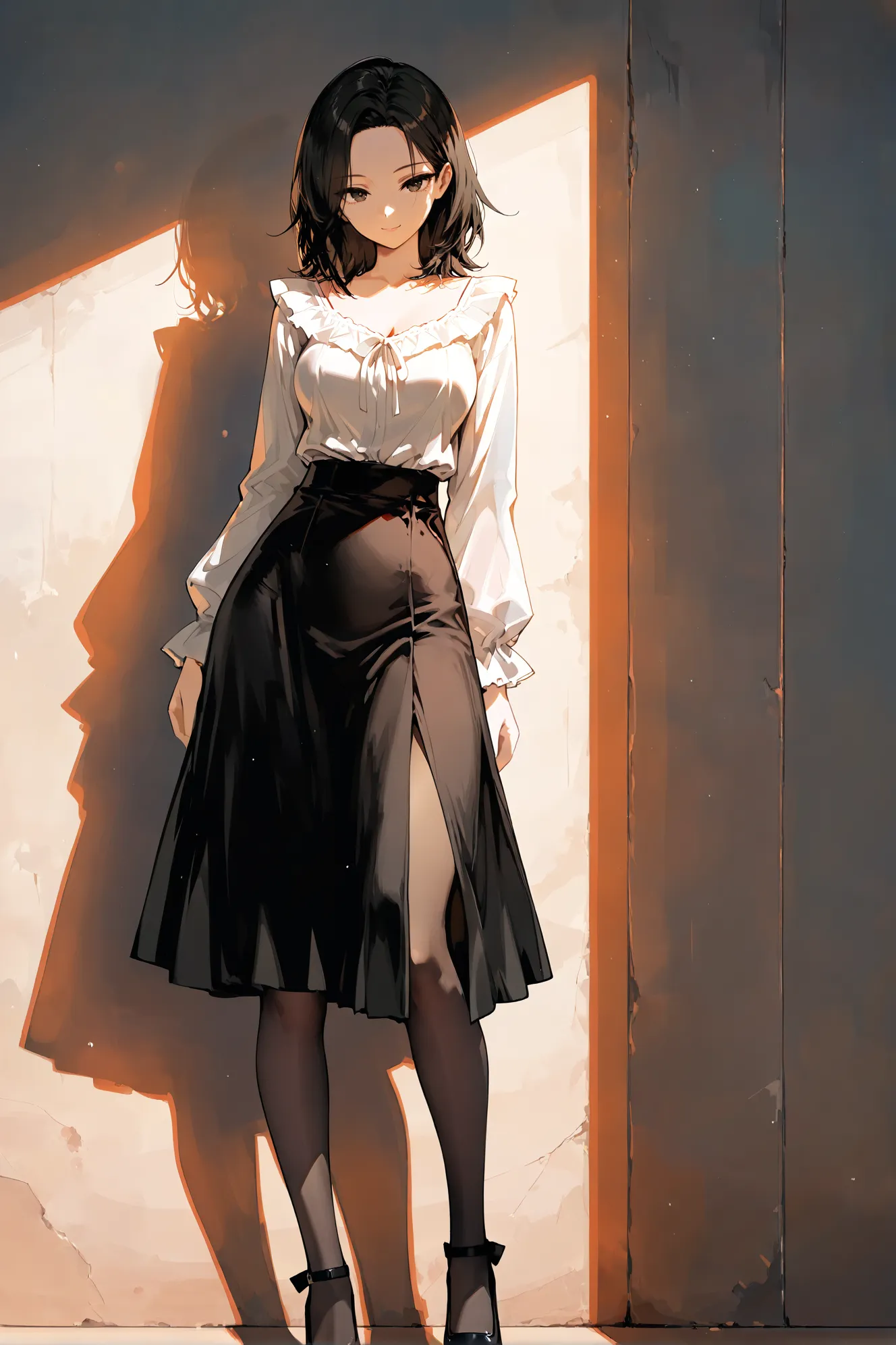 白衬衫勾勒出恰到好处的丰腴,黑纱裙下,两条被肉色丝袜包裹的长腿,在灯光下泛着一层朦胧诱人的光泽。那双腿的线条从挺翘的臀部一直延伸到纤细的脚踝,最后收束于一双精致的黑色高跟鞋中。