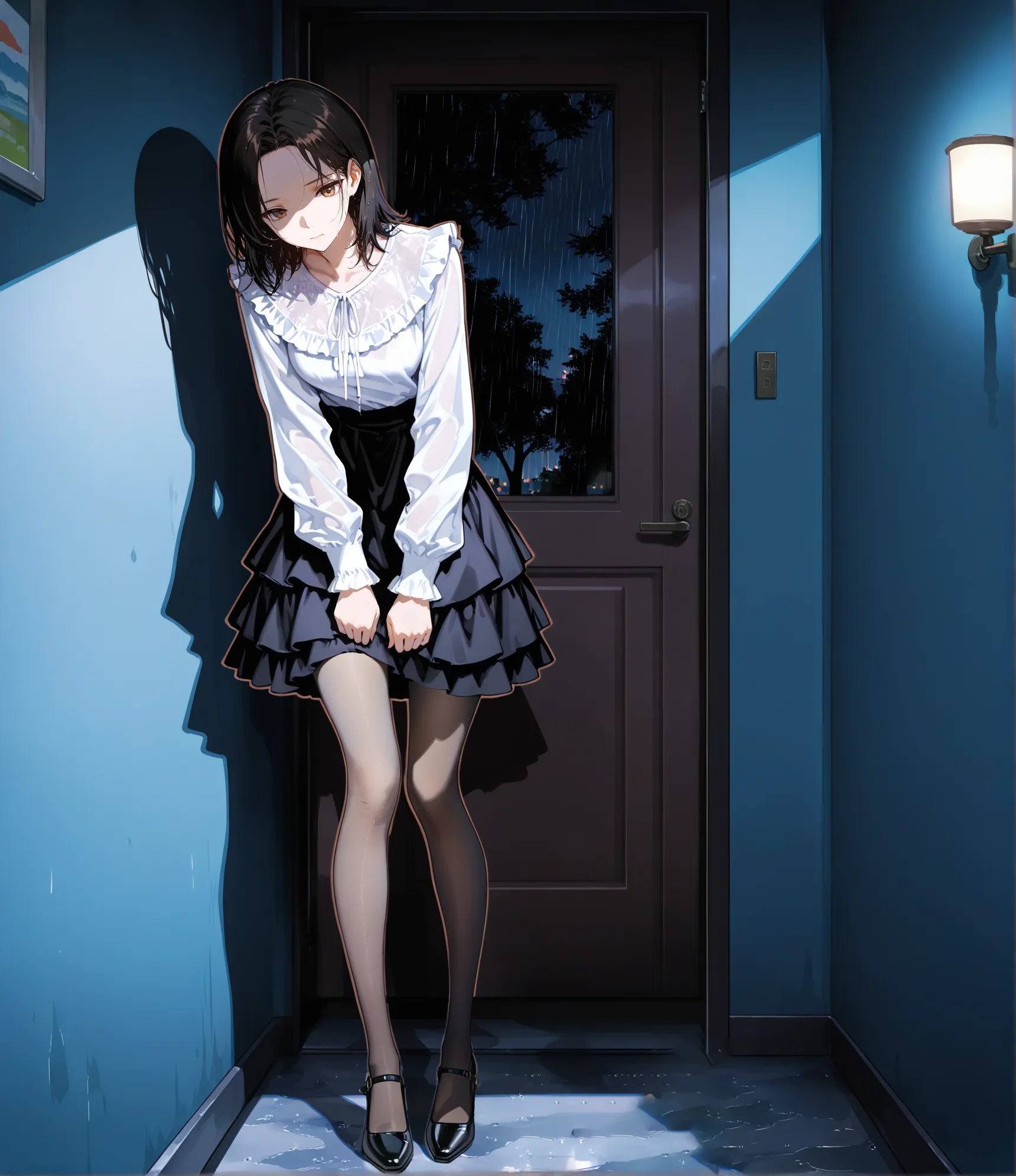 她站起身,那穿着丝袜的脚因为湿透了走在地板上发出“啪嗒,啪嗒”的黏腻声响,她双手提起两只高跟鞋摇摇晃晃的走回了玄关处,机械地将鞋子放进鞋柜。随后僵硬的转身一左一右晃着走回了自己的房间,地上留下了一路的潮湿脚印和点点滴滴的雨水。
