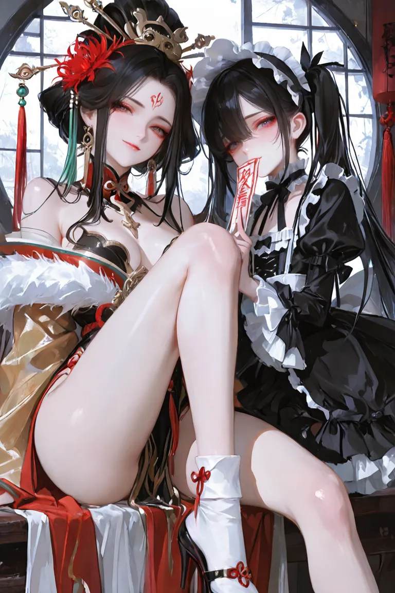 那是一位看起来二十出头的女性,长发如瀑,身着薄纱般的轻裙,裙摆下若隐若现的是修长的双腿,包裹在半透明的黑色丝袜中。她的脚上踩着一双墨色流云纹的高跟鞋,鞋跟细长而锋利,在灯光下泛着冷冽的光泽。