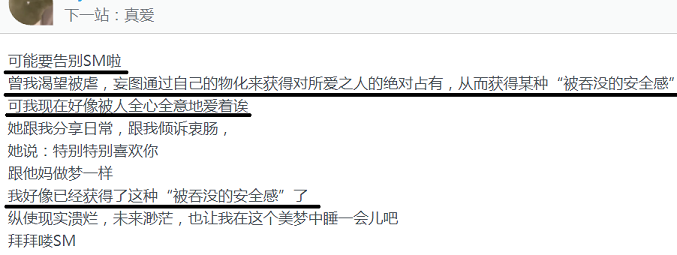 小豆flippy:↑已经入这个小圈子4-5年了吧,没有认过一个主人,可能是我硬件太差了不配吧,之前只尝试过有偿,最近也是想开了,其实自己内心一直都对那些游戏中的内容感触不大,或者说比重比较少,我自己更渴望的是从精神到肉体的,对dom的臣服,是那种把自己彻底交出去的感觉,我觉得自己是很明显的利他型人格,看到dom的愉悦快乐,我自己也很高兴,是那种发自内心的快乐,想要的也是那种没有杂念或外因的感觉。(不喜欢的朋友看到这条,楼上有人提的 谈恋爱 的建议(极大概率)是有效的