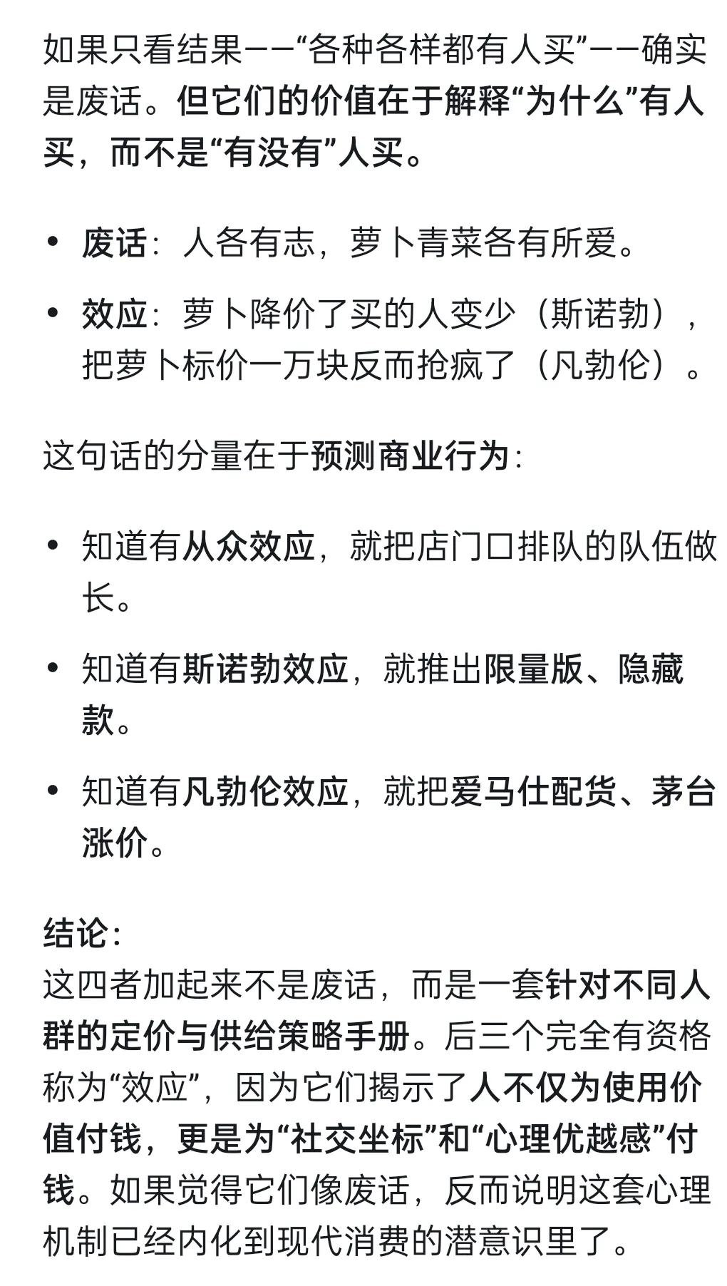关于心理学理论的后验性,我倒是有个挺有趣的例子可举:有“有人喜欢买大众的东西”的从众效应,有“有人喜欢买小众的东西”的斯诺勃效应,有“有人喜欢买贵的东西”的凡勃伦效应,至于喜欢买便宜的东西,那不是效应而是天性。这些理论总共加起来,岂不是一句“各种各样的商品都有人买”的废话?