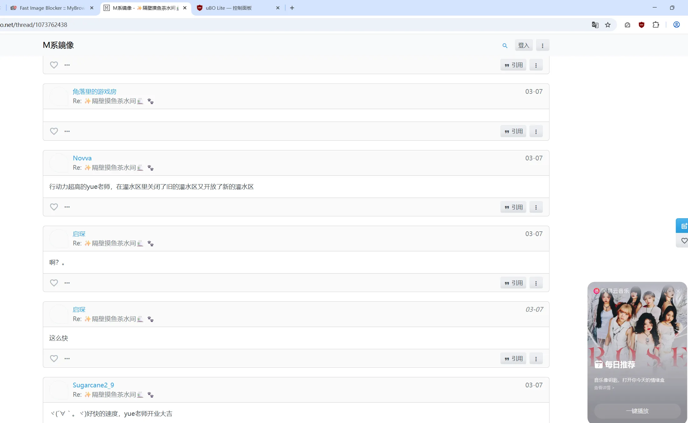 yu-e:↑我暂时使用了一个插件,看上去是可行的。但是应该没有单张图片预览的效果。这是效果:coukou111:↑Chromeyu-e:↑您用的是什么浏览器?我想到一种办法,给您推荐一个一键屏蔽图片的插件,当您准备点进去屏蔽的时候,就一键打开,屏蔽之后再关掉。coukou111:↑心理委员我不得劲yu-e:↑拍拍……或者点进去之后直接闭眼盲滑到底部再操作会不会好一点?启琛:↑有这种功能的话我早就拉黑了……但似乎不会增加针对某个用户的某种操作,比如关注/拉黑。yu-e:↑什么时候能出黑名单功能……拉黑用户启琛:↑现在对那两个ID已经是创伤后应激了 ptsd我前两天不来镜像一方面是k桑在,一方面确实不想看到某些帖子。