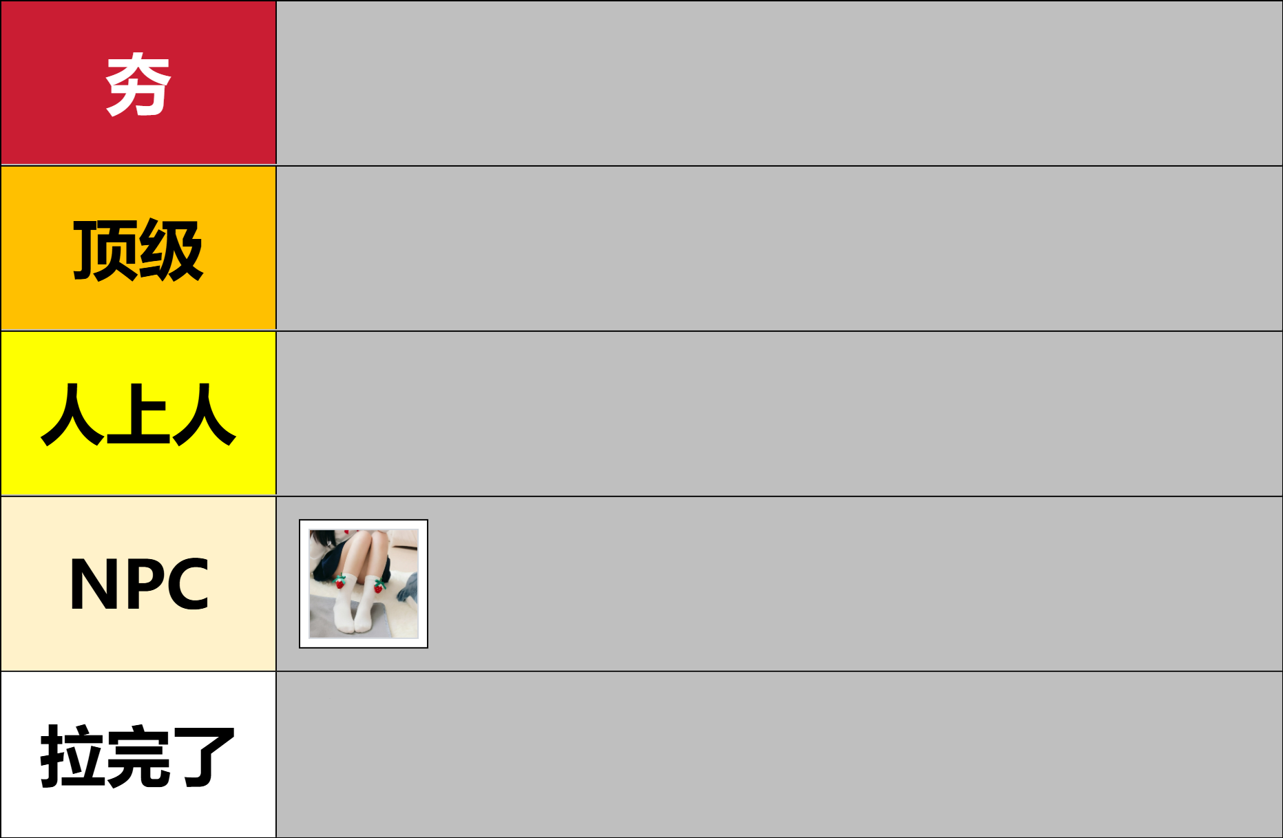 NPC 嘛,平心而论,这双袜子只是在平凡基础上努力做到及格的袜子而已。尽管有着可可大人亲手工艺,却难以掩盖自身平庸的本质。作为开场白尚且合格,但面对可可大人今后精心挑选的各式袜品,终将在百花丛中黯然失色……呜,好悲伤……