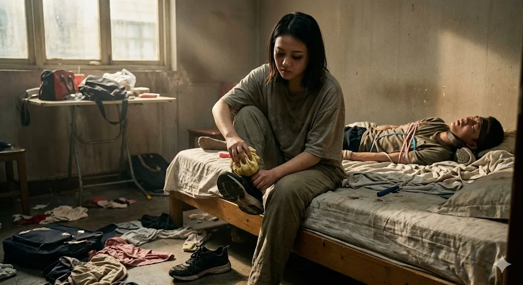一个月囚禁生活的最后一天,晨曦微弱地透进这间破败的出租屋,光影中细小的灰尘在疯狂舞蹈,仿佛在嘲笑这室内发生的一切。与此同时,在名牌大学宏伟的校门口,阿明的女友正站在那块刻有百年校训的巨石旁,她穿着一袭裁剪得体的白色长裙,气质如兰,手中捧着一束象征纯洁的百合,那是她为迎接“远行归来”的男友准备的惊喜,在她的分镜里,他们依然是那对令人艳羡的天之骄子,而在这间噩梦般的小屋里,阿明正经历着人生中最黑暗的“洗礼”。阿香已经彻底剥离了伪装,她当着阿明的面,动作缓慢而充满仪式感地褪去了那身散发着生活琐碎气息的睡衣,露出了一种带有野蛮生命力的、属于底层野草般的躯体。阿明的眼睛里倒映出这个女人疯狂的身影,由于嘴里依然死死塞着那只带着强烈汗碱味的黑色皮鞋,他只能发出像受伤幼兽般绝望的呜咽,每一声都被皮革和鞋垫的味道生生顶回喉咙。阿香此时跨坐在他的胸膛,那股属于廉价沐浴露和常年混迹在吵闹场所的、那种混合了烟草与汗水的复杂气息,如同实质的重压让他几乎窒息。阿香伏在他耳边,语调里带着一种令人毛骨悚然的快意,她轻声说,名牌大学的高材生,既然你总觉得高人一等,那我就让你这辈子都带着我的“味道”回去。说罢,她从那堆积满杂物的桌上取出一件从未洗过的、由于长期排球训练而显得质地僵硬且布满黄色汗渍的护踝。阿兰、阿汐和阿红也围了过来,她们的眼神中没有同情,只有一种跨越阶层报复后的扭曲快感。她们分工明确地合力固定住阿明已经虚弱不堪的身体,阿红甚至故意将她那双刚从球场回来、腥臭味浓烈到令人作呕的专业排球袜,在阿明的鼻尖疯狂揉搓,迫使他进行最深沉的屈辱式呼吸。随后,阿香用那种几乎要勒断骨头的力道,将那只充满汗味的护踝强行套在了阿明的额头上,作为一种病态的、挥之不去的耻辱冠冕,并用几根沾满污渍的旧丝袜将他的手脚最后一次死死反缚。那一刻,阿明在极度的缺氧与精神崩溃边缘,看到了一组幻觉般的分镜:一边是女友清冷高雅的脸庞,正期待地看向校门远方;另一边是阿香那张带着残忍笑容、满是油光的脸庞,正一点点逼近他的瞳孔。阿香最后用力拍了拍被皮鞋塞得变形的阿明的脸颊,冷笑着撤去了所有的门闩。当阿明最终像一具没有灵魂的躯壳、拖着满身廉价丝袜勒出的红痕和满脑子挥之不去的腥臭味走出那栋破旧民房时,阳光刺痛了他的眼睛。他跌跌撞撞地走在繁华的街道上,路人纷纷侧目,因为这个曾经的精英学子,此刻嘴唇上还残留着皮鞋内衬的暗色压痕,他的头发里夹杂着出租屋的霉灰,而最可怕的是,他发现自己竟然已经习惯了那种浓烈的汗酸气,甚至在闻到路边垃圾桶散发的异味时,身体会本能地产生一种奴隶般的战栗。当他在校门口远远看到白裙胜雪的女友时,他并没有感到救赎,而是感到了一种深入骨髓的肮脏,他意识到,那个在象牙塔尖上指点江山的阿明已经死在了阿香的皮鞋底下,死在了那间不到十平米、充满大专生汗臭味的破屋里。他与女友之间的距离,不再仅仅是几步之遥,而是隔着一个永远无法逾越的、由皮鞭、绳索与廉价皮鞋构建的深渊。他瘫倒在校门外的阴影里,任由那股属于阿香的、属于生活最底层的味道,将他最后一丝身为精英的尊严彻底吞噬,完成了这场名为“邂逅”实则“毁灭”的疯狂仪式